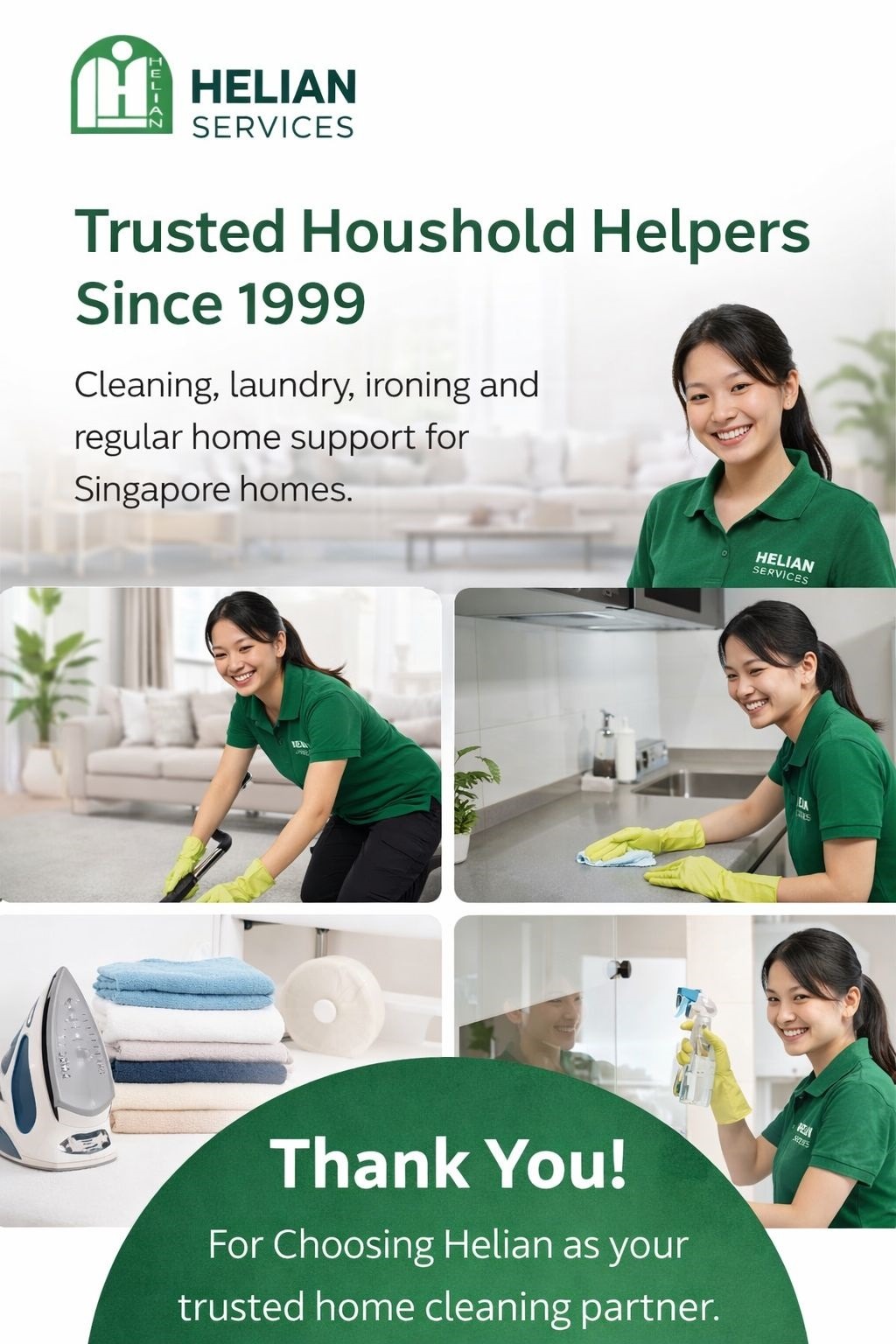 Helian Services is a licensed household domestic services provider in Singapore and we focus on providing trustworthy part-time helpers for regular household cleaning.